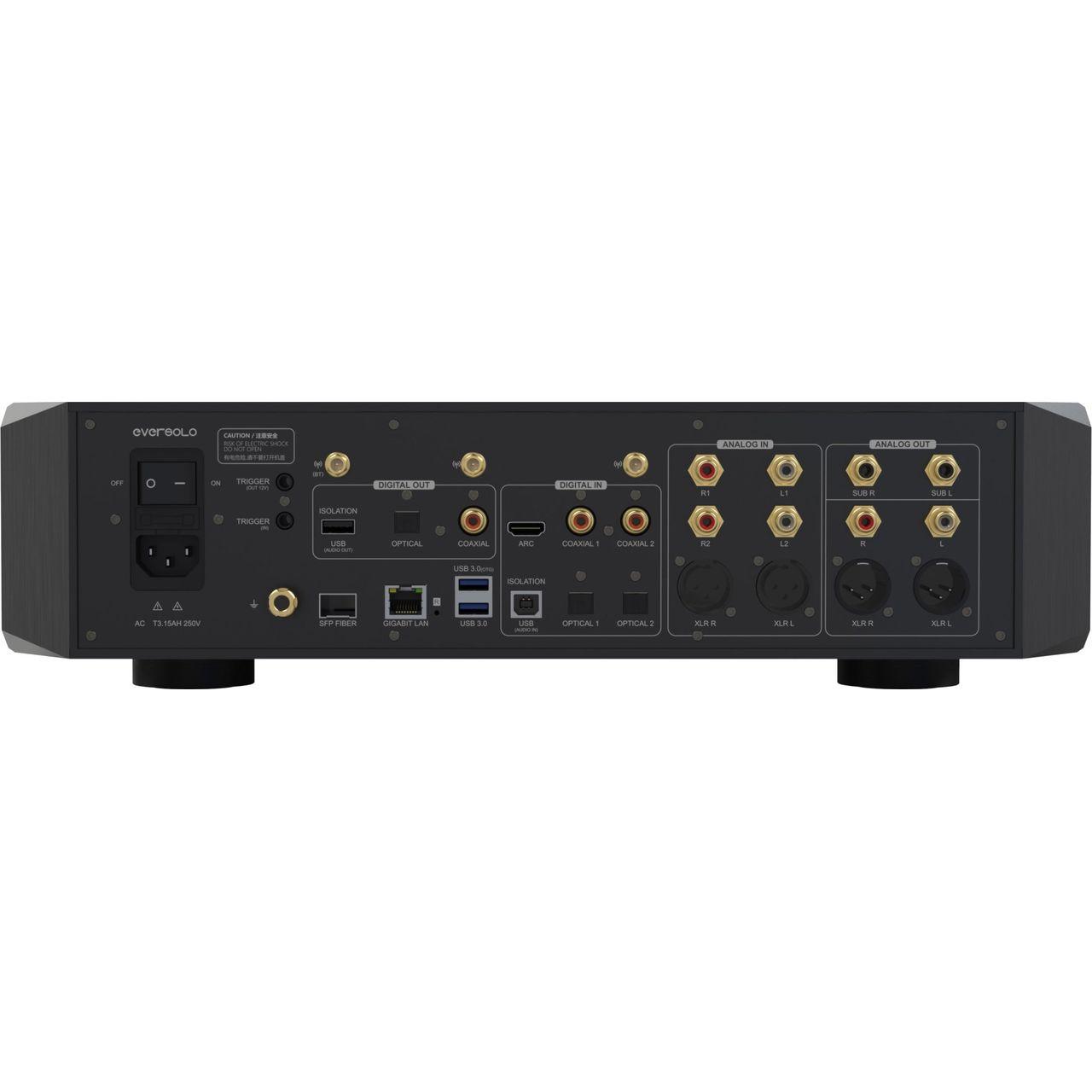 Der Eversolo DMP-A10 ist mit einer leistungsstarken, vollsymmetrischen Vorverstärkerschaltung ausgestattet, die analoge XLR/RCA-Eingänge unterstützt. Er verfügt über eine analoge Verstärkung von +10 dB und den analogen Lautstärkeregler R-2R, der ein extrem geringes Rauschen und eine geringe Verzerrung gewährleistet und einen besseren Rauschabstand, Dynamikbereich und andere Leistungskennzahlen bietet.