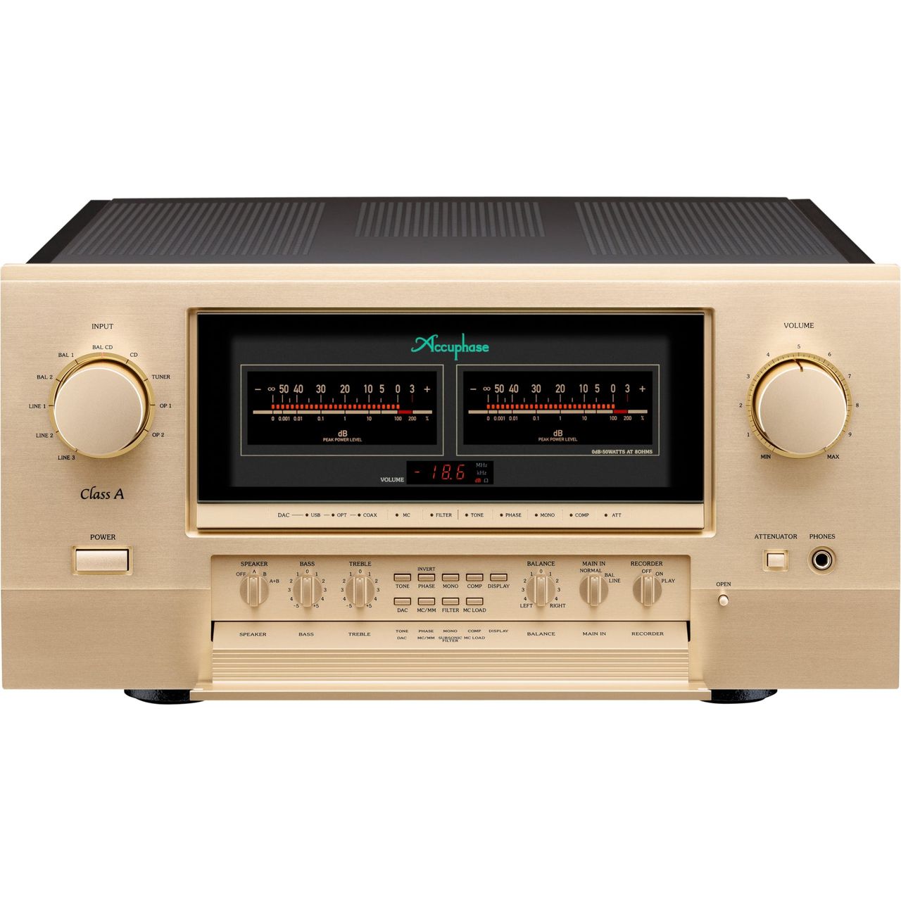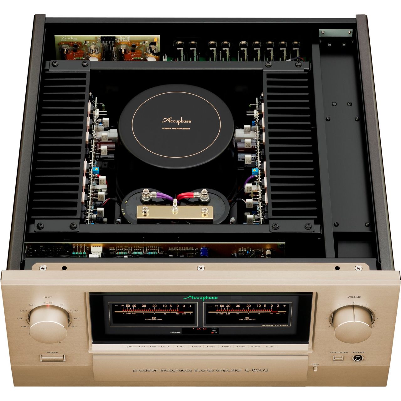 Mit einem garantierten Dämpfungsfaktor von 1000 (gleichauf mit Accuphases Top-End-Endstufe A-80) treibt der E-800S auch schwierige Lautsprecher mit eiserner Kontrolle an. Möglich wird dies durch Balanced Remote Sensing, MOS-FET-Schalter mit minimalem Widerstand (1 mO) und goldbeschichtete Signalwege.