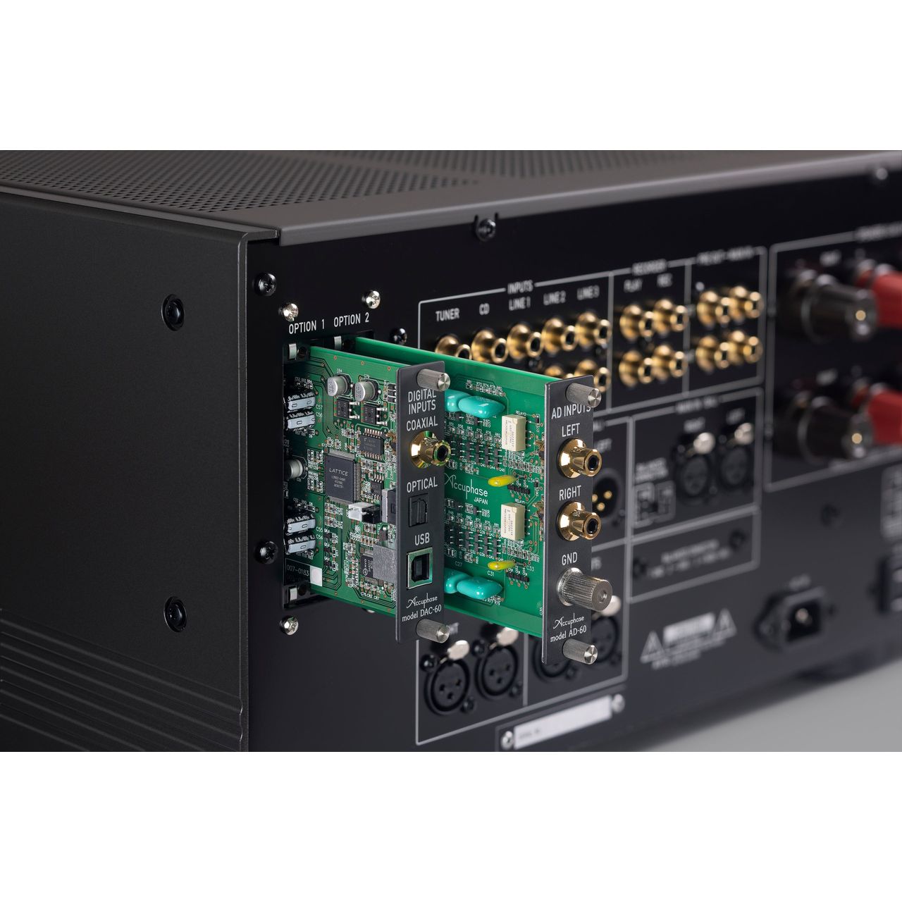 Zwei Steckplätze auf der Rückseite ermöglichen den Einbau von DAC-60 (digitale Eingänge) oder AD-60 (Phonoeingang für MM/MC) – mit direkter Steuerung über das Multifunktionsdisplay an der Front. Damit ist der E-800S bereit für PC-Audio oder Vinyl-Liebhaber.